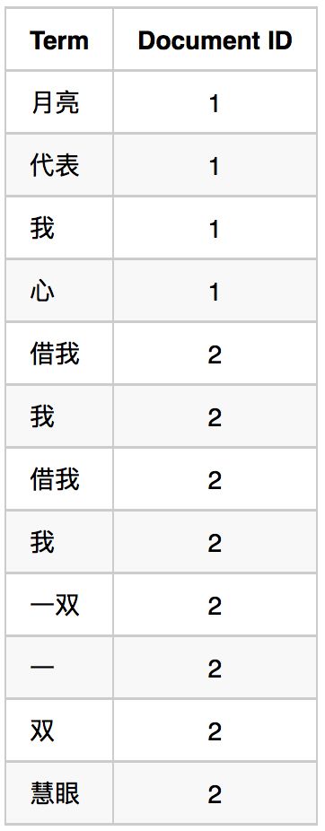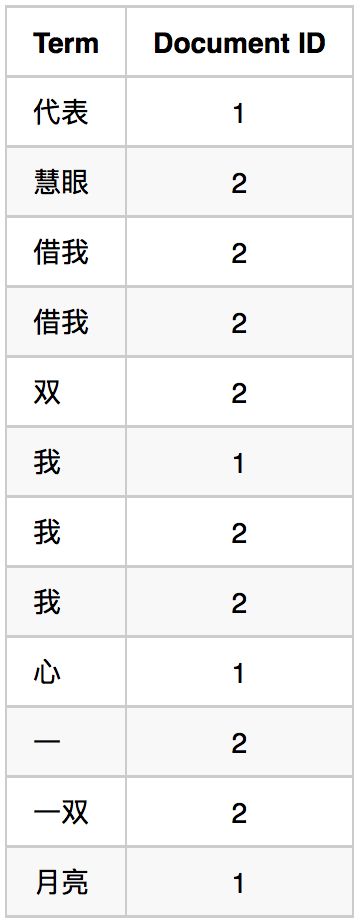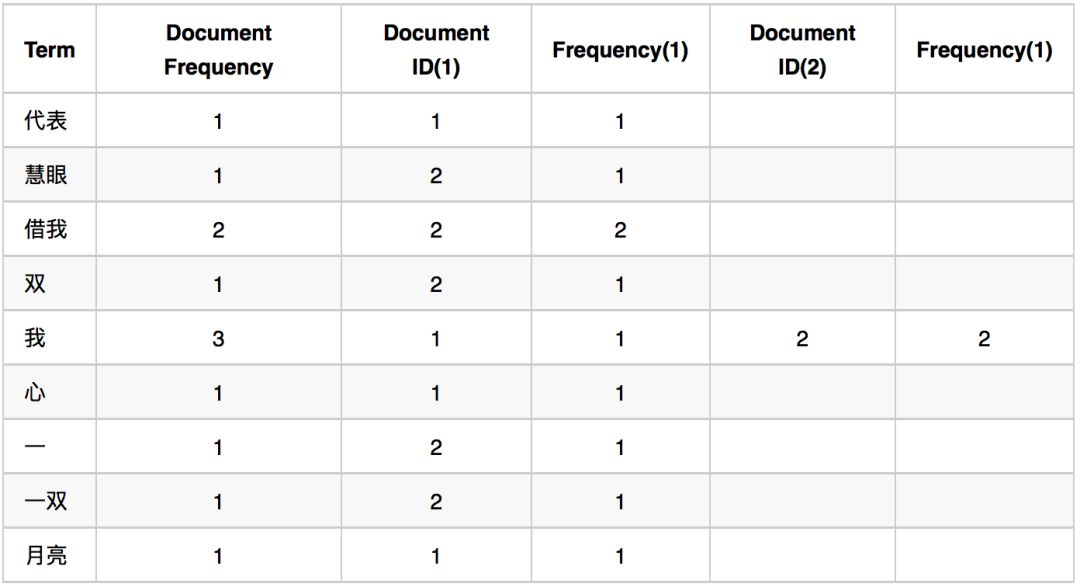 右边是字符串的文档(Document)编号链表,称为倒排表(Posting List)