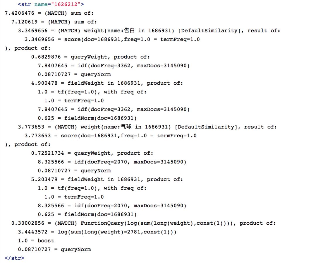 下面譬如在我们唱吧中搜索(告白气球),用querydebug取一条数据来分析(q:告白气球&&qf:name):