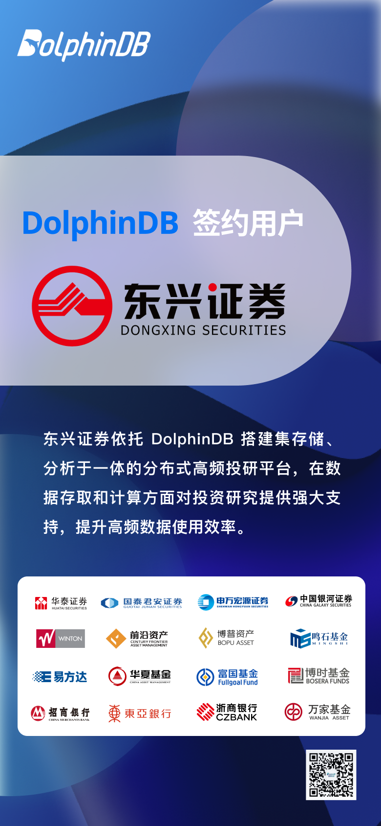 东兴证券依托 DolphinDB 搭建集存储、分析于一体的分布式高频投研平台,在数据存取和计算方面对投资研究提供强大支持,提升高频数据使用效率。