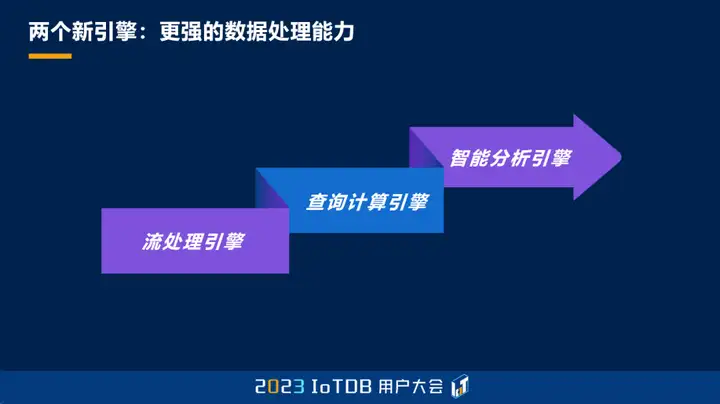 接下来是两个新的引擎。首先,中间是我们原来的查询计算引擎,这种引擎通常用户跟 IoTDB 的交互都是通过写一个 SQL 或者发一个命令过来,经过一些计算返回给用户,这种都是通过操作来去触发的。那我们希望这个数据处理的模式能够更加的丰富一些,所以我们向前扩展了流处理的引擎,这种引擎的处理方式是数据触发的,当数据到达的时候,就可以去做一些实时的处理。向后我们去增加了智能分析的引擎,它的这种方式是算法出发的,也就是我们会集成更丰富的一些数据处理的能力,从而在全方位的去挖掘数据的价值。