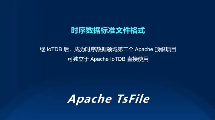 那么,TsFile 一直是 IoTDB 的一个内部的模块,为什么说 TsFile 是一个项目呢?第一个原因就是 TsFile 本身是提供一个文件级的 API 的,我们可以不用 IoTDB,直接把数据写成 TsFile,同时能够去读这个文件的数据的内容。第二个原因就是,在上个月的 Apache 董事会上面,TsFile 被正式投票通过了,成为了一个 Apache 的顶级项目,这也是标志着时序数据领域第二个 Apache 的顶级项目。所以 TsFile 现在有了新的项目名字,叫 Apache TsFile。那它的定位就是时序数据的一个标准的文件格式,就可以独立于 IoTDB,可以去直接使用,也可以和 IoTDB 形成一个生化反应。