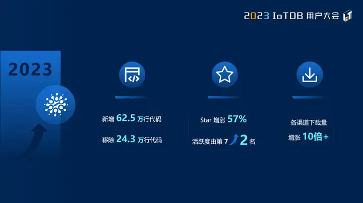 那首先我们可以来看几个数字。在 2023 年一年的时间里面,我们一共更新了 80 多万行的代码,并且在开源的 GitHub Star 增幅了 57%。现在,Apache 基金会已经有 360 多个项目了,在这 360 多个项目里边,IoTDB 的活跃度从去年的第 7 名成长到了第 2 名。那一个更直观的效果也可以看到,在各个渠道的 IoTDB 的版本下载量已经达到了 10 倍以上的增长。