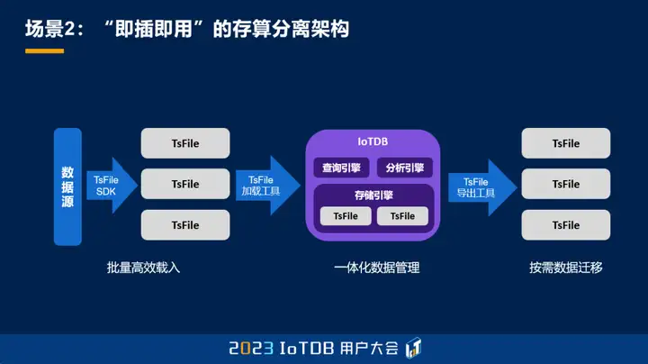 另外一个场景就是 TsFile 可以和 IoTDB 形成一个即插即用的、存算分离的架构。这种方式当我们把数据源整理成一些 TsFile 文件之后,我们发现这些文件可能我们需要进行一个统一的管理,希望使用一个 SQL 去访问它们。那这个时候就可以把它们去加载到 IoTDB 里面,进入一个存储引擎。这种加载其实只需要构建最简单的一些索引,就可以对上层提供查询、分析的这些服务,也就实现了查询和分析的一体化。