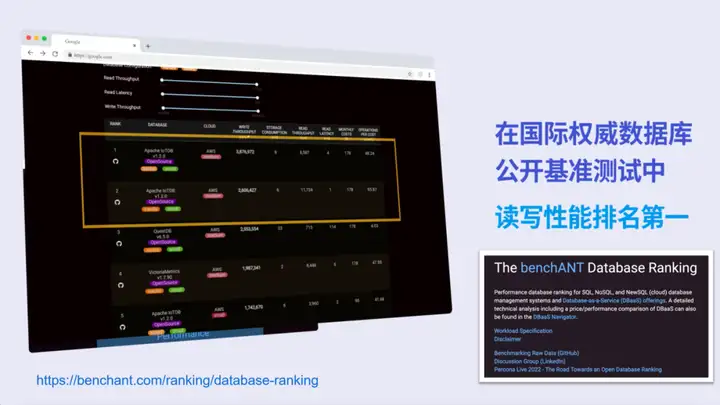 此外,在今年的国际权威数据库的公开基准测试中,是一个国际的 benchANT 的榜单,我们在读写性能,包括压缩比,以及整体的资源消耗和成本方面都排名第一名。这样一个榜单,它使用的是时序数据库的基准测试,叫 TSBS,应该大家可能听过。这项测试其实是比较权威的一个测试工具,那 benchANT 他们采用的是这个工具,而且所有的竞品、所有的产品都选择同样的参数,以及同样的 AWS 的机器,并且是由 benchANT 的官方人员来执行的这个测试,所以这个 benchANT 榜单会更具有公平性和参考性。