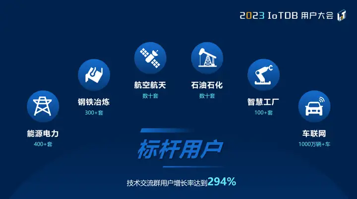 进步不仅是在代码和功能层面,也会体现在用户的选择上面。那现在 IoTDB 已经在我国的一些关键行业领域里面得到了广泛的应用。比如能源电力行业里面,我们有在华润电力,在中国核电,在大唐集团,有了深度的使用。那么在钢铁冶炼方面,我们有在宝武钢铁集团,在中冶赛迪集团,服务了国内的很多个钢厂、电厂。那么在航空航天方面,我们在商飞的飞机试飞场景,包括成飞的飞机制造场景,也有了落地的应用。
