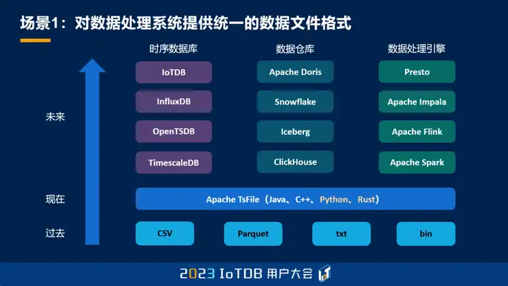 它的场景主要有两个,第一个是对数据处理系统,提供一个统一的数据文件格式。过去,我们可能在一个大的工业平台里面,会缺少一个专门管时序数据的文件,所以大家可能都去自己选择不同的文件格式来使用,包括 CSV、Parquet、txt,甚至一些厂家自定义的这种二进制的文件结构,那这些文件结构其实不太利于我们去做数据的统一的管控,以及数据的治理。现在有了 TsFile 之后,所有的时序数据就都可以写成 TsFile。我们可以提供一个标准的、统一的接口,那这个接口目前我们已经具备了 Java 和 C++ 版本,未来也会去扩展 Python 和 Rust 等版本。