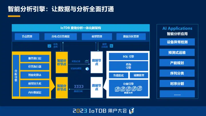 下一个是智能分析引擎。我们之前 IoTDB 有两类节点,第一类是数据库的管理节点,第二类是数据库的数据节点。那我们今年也增加了一个新的节点,叫 AINode,也就是智能分析节点。通过这种集成,使得一些智能的分析算法不再需要在外部去执行了,我们可以直接在数据库内部去做数据的分析,通过这种方式将数据和分析进行全面的打通,也就是现在说的 Data + AI 这样一个方向。