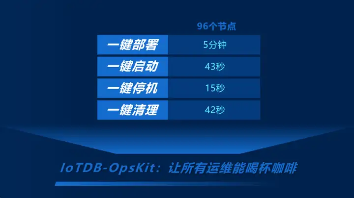 首先,因为 IoTDB 是一个分布式的架构,它的部署肯定需要涉及到多个节点的状态和服务的维护,会比单机更加复杂。因此我们开发了 IoTDB 的 OpsKit,它是一个 IoTDB 的集群管理工具。它的主要目的就是一句话:让所有的运维人员能够有时间来喝杯咖啡,所有的集群的部署、启动、停止都能够用一行命令来完成。在我们国内一个最大的集群规模的案例里面,我们有 96 个节点要去维护,那它的部署只需要 5 分钟,启动、停止和清理只需要几十秒,从而大大地解放了人力。