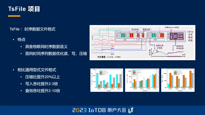 TsFile的全称是 Time Series File,时间序列的文件格式。它的特点就是针对物联网时序数据,提供了它的管理和处理的语义。那也针对这种物联网时序数据的负载,我们优化了文件的写入、查询,包括存储、压缩比等等。在这些维度上面,我们会相比一些通用的文件结构,包括 Parquet、ORC、CSV 等等,能够有 2 到 10 倍以上的性能提升。