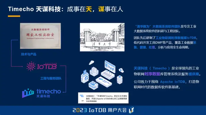 那为了做这件事情,我们就成立了 Timecho,中文叫天谋科技。三国演义里面有一句话,叫“谋事在人,成事在天”,主要强调的还是人努力之后,最终的结果还是取决于老天。但是我们把这句话的顺序给调整了一下,虽然“成事在天”,但是“谋事在人”,一切事在人为。未来,清华和开源社区会去继续进行技术的创新,而天谋则会围绕开源版进行产品的打磨,让技术创新不止停留在科研、论文,也要落地到祖国的大地上,落地到每一个用户的心里。