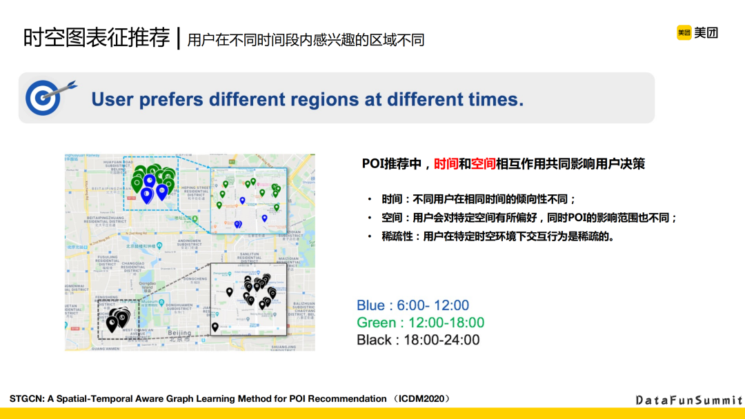 POI推荐里面时间和空间其实是相互作用的,共同影响着用户的决策。左边这张图,不同的颜色表示用户在不同时间段对区域的一些偏好性。蓝色表示的是早上6点到12点的用户偏好,绿色表示的是用户在下午的偏好,晚上则是用黑色来表示。首先,从时间上,可以看到不同用户在相同时间的倾向性不同。然后,从空间上,用户会对特定空间有所偏好,同时POI的影响范围也不同。再看稀疏性,用户在特定时空环境下交互行为是稀疏的。比如像早上蓝色时间段,倾向的POI数量是比较少的,而晚上和下午则相对比较稠密。