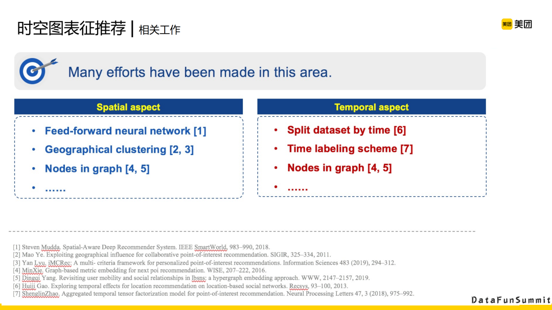 空间相关的工作,有把整个大图按照空间做划分,或者把空间当作时间的节点。时间上面的工作,是把大图按照时间分成几个组,独立地训练。或者把时间当作节点的特征,或者把时间当做一个独立的节点,在图上面做表示。缺乏一个把时间和空间联合起来进行建模的有效方案。