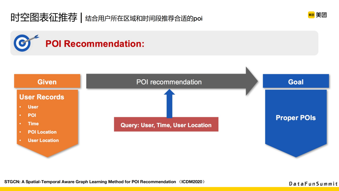 综合来看,我们要做时空的推荐,应该结合用户所在的区域和时间段进行推荐。上下文场景是对于用户在某个时间段我们给他推一些候选POI,然后由候选POI的位置,以及用户所在的位置,在这种情况下我们怎么结合上下文给用户推荐到合适的POI,是我们建模要解决的。