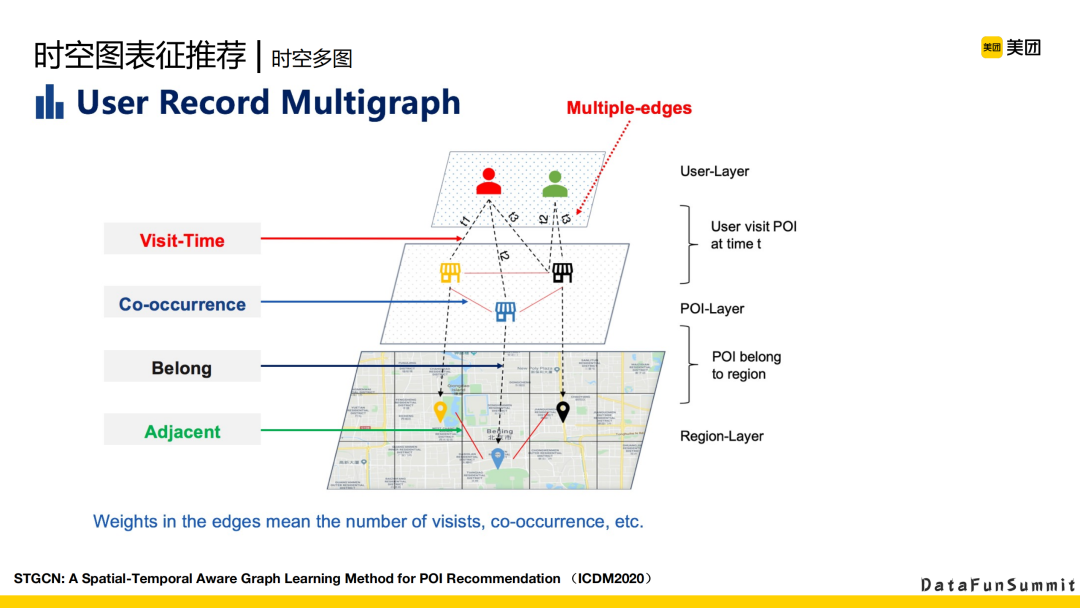 这里介绍一下我们的构图方案。这是一个多图。首先,看用户和POI的连接,我们对用户和POI连接的边分成了多个时间段,每个时间段会有一条边,这就构成了多边。POI和POI之间的连边,主要是考虑贡献的关系,比如用户共同的点击、共同的下单行为。其次,是POI和区域AOI的从属关系,以及用户和AOI的从属关系。AOI和AOI之间可能也有自己的一个相邻的连边。这些整体构成了我们整个STGCN构图的一个全景的框架。