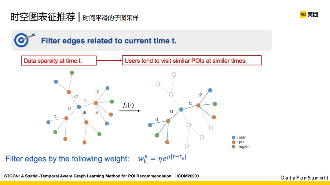 采样部分,我们构造出来是一个多图,一个用户可能在多个时间段都对同一个POI进行了访问。首先,我们会以时间作为因子,去对全图进行一个子图的采样。每条边采样的权重,是根据当前采样的时间节点,以时间偏差作为采样的因子。上图中的公式代表与目标的时间相差越小,也就是距离这个时间越近的一条边,被采选的概率会越大。这样就可以解决有一些边上交互起来比较稀疏的一个问题,使得采样出来的数量比较平滑。