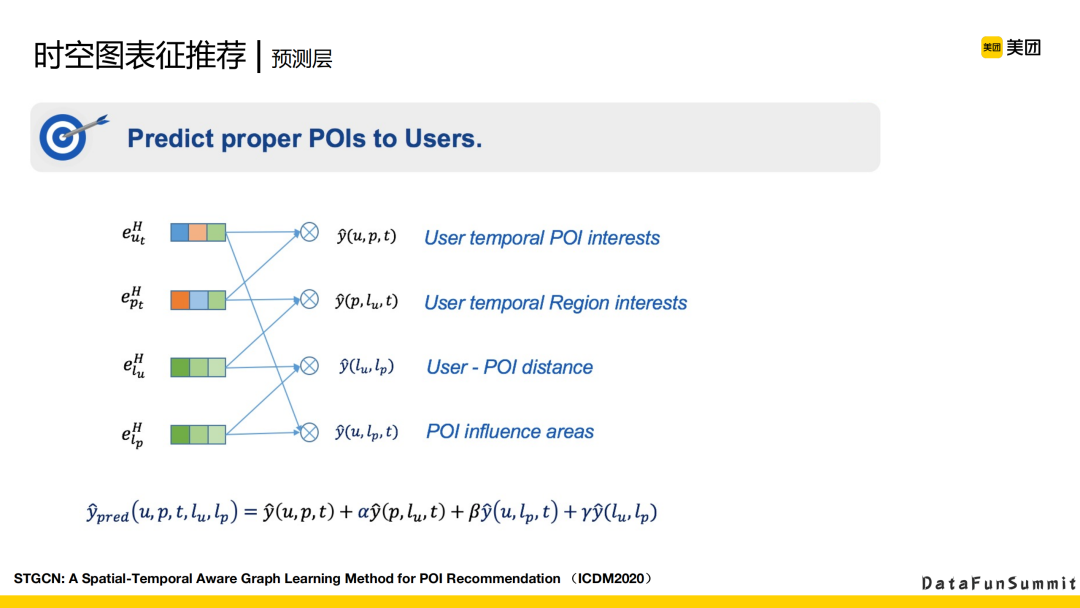 首先是在t这个时刻,用户对POI的兴趣。然后是在这一时刻,用户对区域的兴趣。还有在这个时刻下用户与POI所在区域的距离,以及这些区域对POI的从属。我们还会有一个加权的系数。