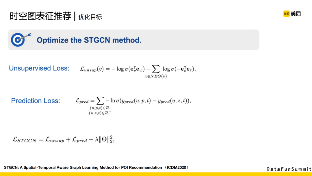 优化方面有两个Loss。第一个是优化图本身经常用的一个Loss,比如节点之间,相连节点的embedding,以及它复采样出来一些节点embedding,希望相连节点变得尽可能的相似,复采样出来的节点embedding尽可能的远。第二个,就是对预测层的一个Loss。样本是用户在t时刻交获的POI,副样本就是用户在t时刻以前没有交的POI采样作为副样本。最后一个整的Loss就是上面这两部分Loss,再加上对系数的一个正则化。