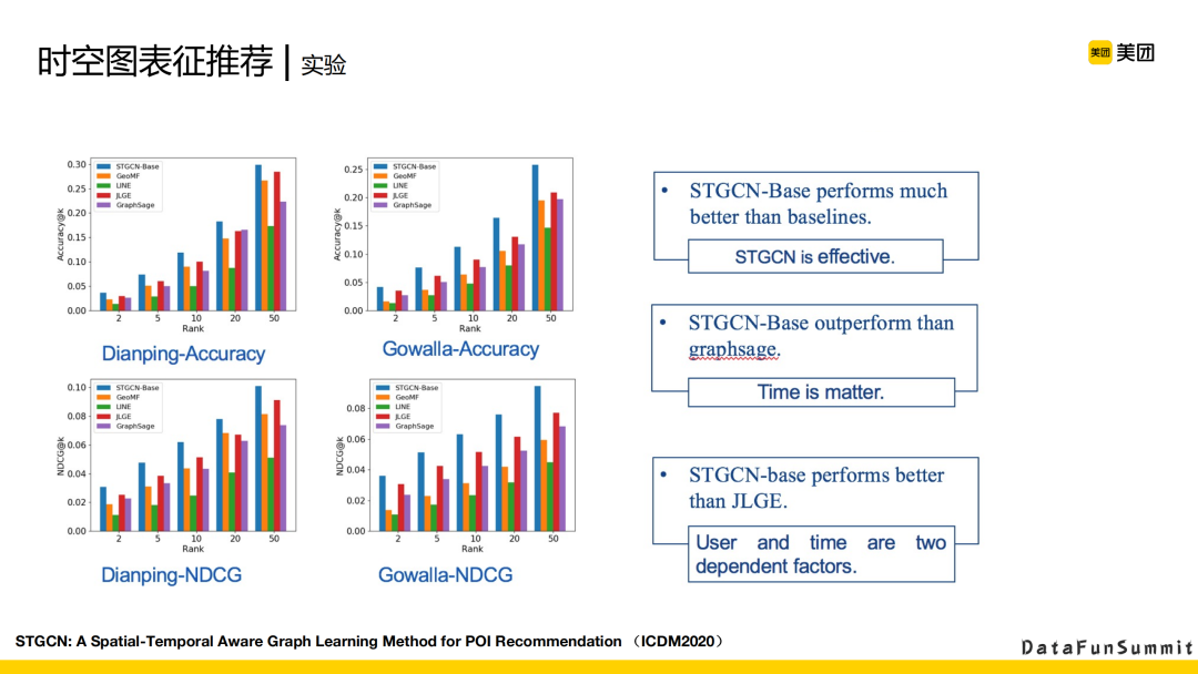 对两类数据集——点评和Gowalla的实验,采取了大概一个月的时间,用户对POI的点击。可以看到,相比传统的GOF、LINE,加上时空考虑的模型取得了更好的效果。