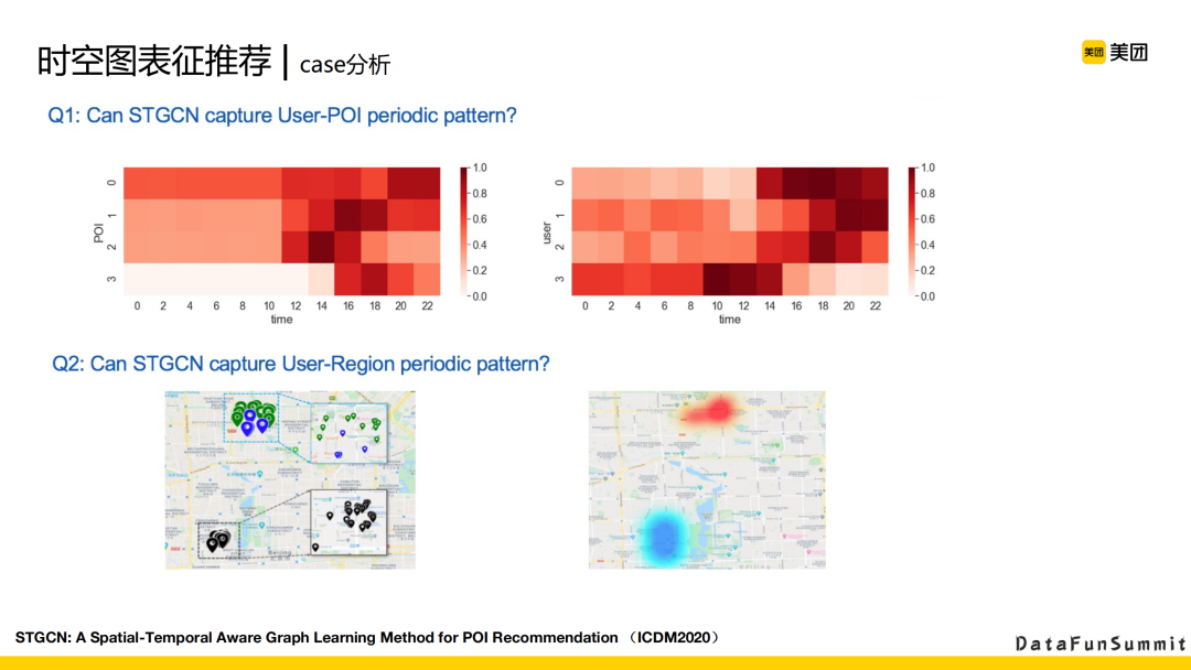 第二个问题就是STGCN能不能捕捉到用户和区域上面的一些周期性模版。前面我们假设用户在不同的时间段里会对不同的区域感兴趣。右下图也可以看到,在不同的时间段,用户attention高的区域也是会分布在不同的区域范围内。早上可能是在上面的红色区域,晚上可能是在下面的蓝色区域。
