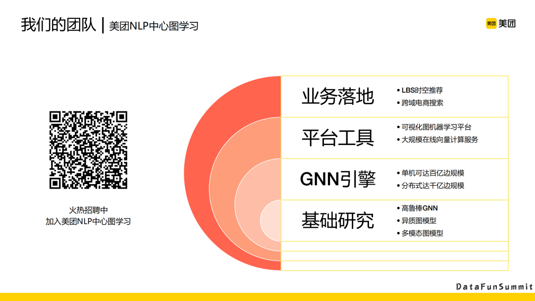 综上,我们看到了图表征学习在美团推荐中的不同场景、不同时空下的应用。当然,未来,我们还有很多问题要解决。比如业务场景跨度大,和部分业务低频但很重要等问题。为了解决这些问题,我们现在在做的是跨域图表征的一些预训练。整合我们外卖、酒店、美食、旅游、优选、娱乐、买菜的数据,要去训一个大图,训练出大图之后,怎么再进行反复的操作,或是联合下游的一些排序模型,或者一些召回模型进行联合训练,这都是我们继续要做的工作。未来我们还会面临一个千亿边规模的快速稳定训练的挑战。我们现在最大规模的图可能也只有80多亿,未来跨域之后,可能把更多的交互行为考虑进去,图会越来越大,要如何稳定地训练,并且训练出来的图有效果,这也是我们未来要继续做的事情。