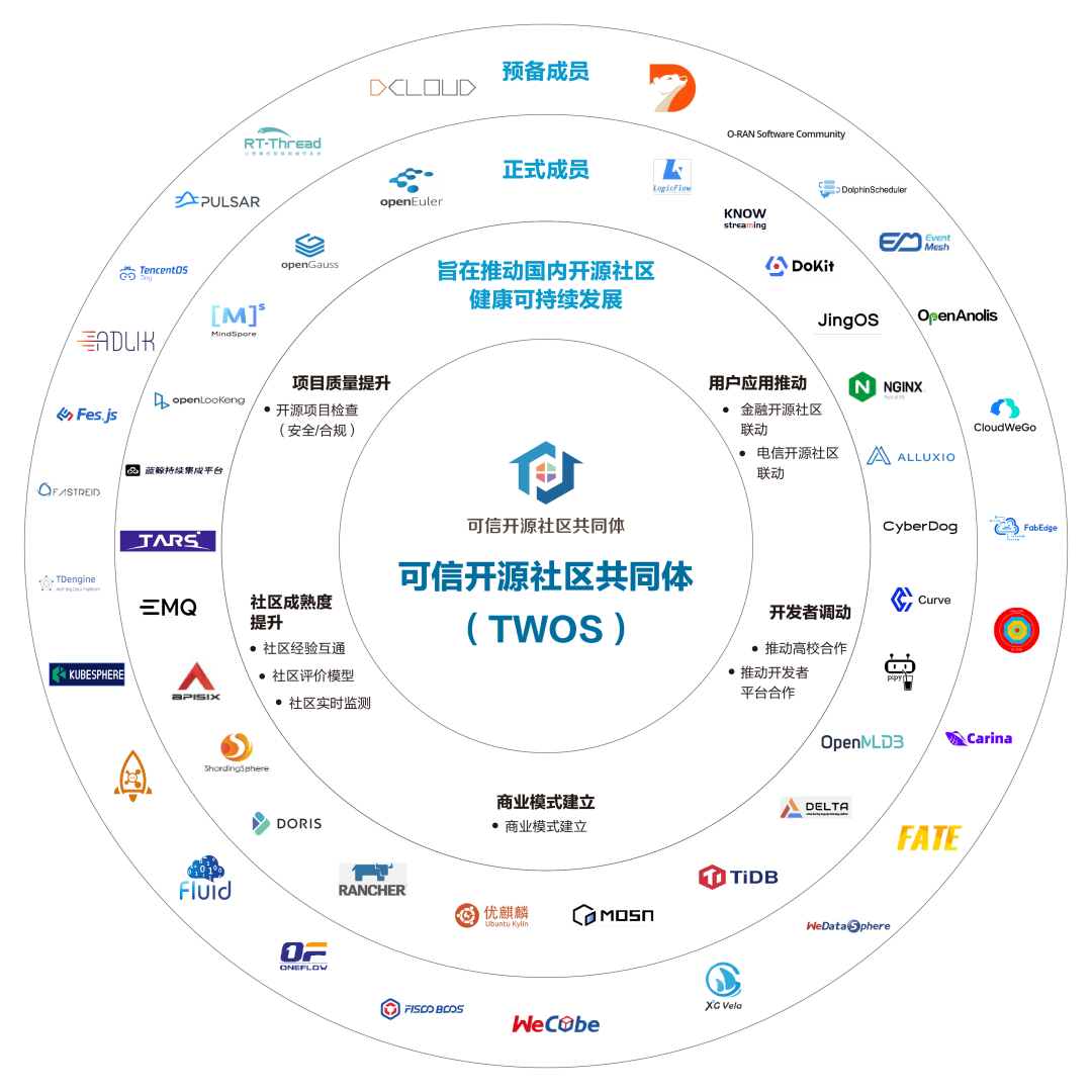 此次案例集中收录的23个开源项目与社区均为可信开源社区共同体(TWOS)正式成员。可信开源社区共同体(TWOS)于2021年9月在“2021 OSCAR开源产业大会”上正式成立,由众多开源项目和开源社区组成,目的是引导建立健康可信且可持续发展的开源社区。可信开源社区共同体旨在搭建交流平台,提供全套的开源风险监测与生态监测服务。目前社区共有正式成员25名,预备成员26名。