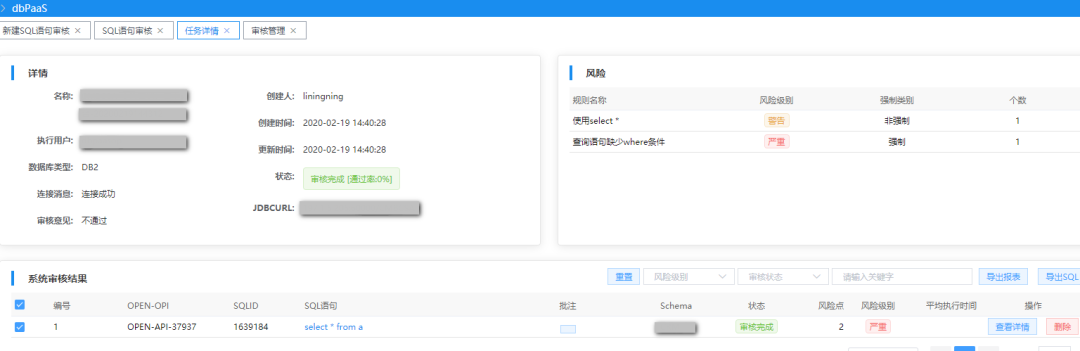 审核结果展示:展示数据库连接信息、SQL明细、SQL执行计划、SQL所含对象详情、触发规则、触发次数等。