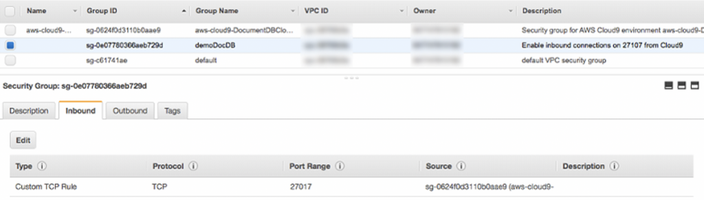 在此步骤中,您将使用Amazon Elastic Compute Cloud(Amazon EC2)创建一个新的安全组,借此从Amazon Cloud9环境中的端口27017(Amazon DocumentDB的默认端口)连接至Amazon DocumentDB集群。