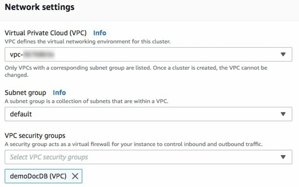 8.在Network settings部分的VPC security groups当中, 选择demoDocDB。