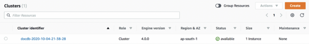 1.在Amazon DocumentDB控制台上的Clusters页面中,选择Create。