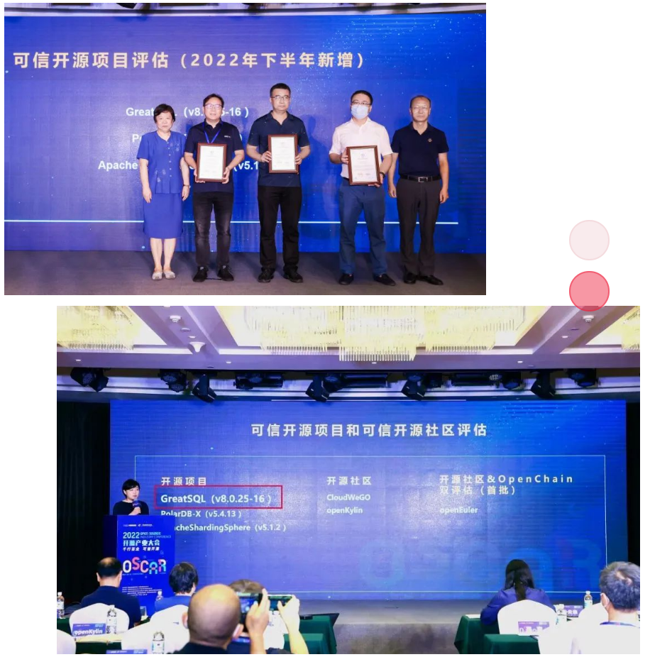 与此同时,经过组委会及评审机构的严格评估遴选,GreatSQL社区接连入选了科技制造开源社区和可信开源社区共同体两项社区体系成员单位,并加入TWOS“银行计划”组织,现场获得授牌。