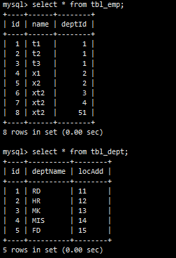 CREATE TABLE tblA(#id int primary key not null auto_increment,age INT,birth TIMESTAMP NOT NULL);INSERT INTO tblA(age,birth) VALUE(22,NOW());INSERT INTO tblA(age,birth) VALUE(23,NOW());INSERT INTO tblA(age,birth) VALUE(24,NOW());CREATE INDEX inx_A_ageBirth ON tblA(age,birth);SELECT * FROM tblA;