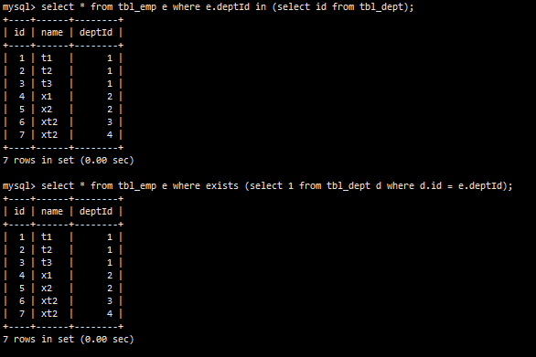 1.EXISTS(subquery)只返回TRUE或FALSE,因此子查询中的SELECT * 也可以是SELECT 1或SELECT 'X'等其他,官方说法是实际执行时会忽略SELECT清单,因此没有区别。