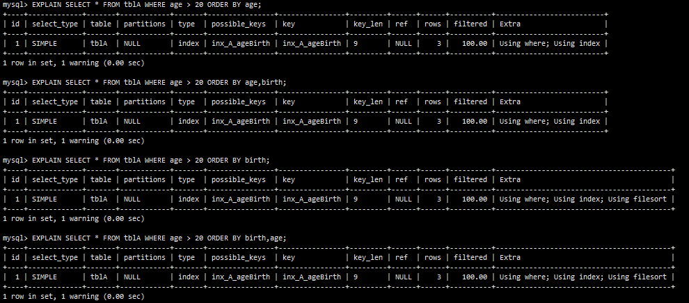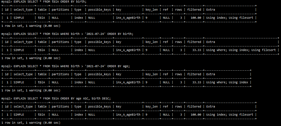 1.EXPLAIN SELECT * FROM tblA ORDER BY birth;2.EXPLAIN SELECT * FROM tblA WHERE birth > '2021-07-24' ORDER BY birth;3.EXPLAIN SELECT * FROM tblA WHERE birth > '2021-07-24' ORDER BY age;4.EXPLAIN SELECT * FROM tblA ORDER BY age ASC, birth DESC;
