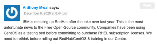 还有一个办法是转投其他的Linux阵营,比如使用Ubuntu,Debian,SUSE 等等,这些版本的Linux也都有企业版本,且提供不同年限的支持。不同的应用软件在这些Linux上的行为可能有所不同,稳定性也需要经过测试,在CentOS Linux上投资多年要转过去,稳定性还要重新测试,又是大量的成本。在CentOS那个帖子下面的评论里,大量的网友也对RedHat的行为表示了失望,并想着转投其他阵营。有一个叫Anthony Mwai的网友说在IBM收购RedHat以后,这是对免费开源社区是一个巨大的打击。