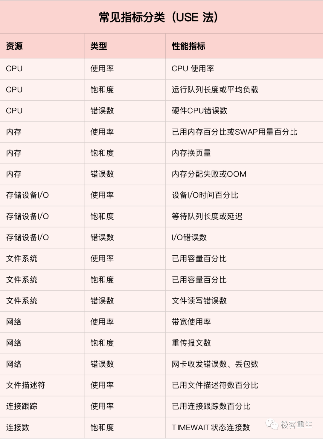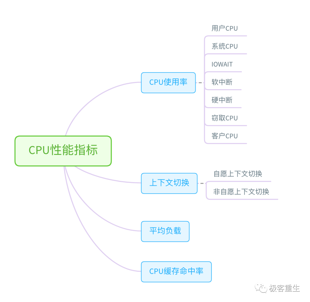 首先,从 CPU 的角度来说,主要的性能指标就是 CPU 的使用率、上下文切换以及 CPU Cache 的命中率等。下面这张图就列出了常见的 CPU 性能指标。