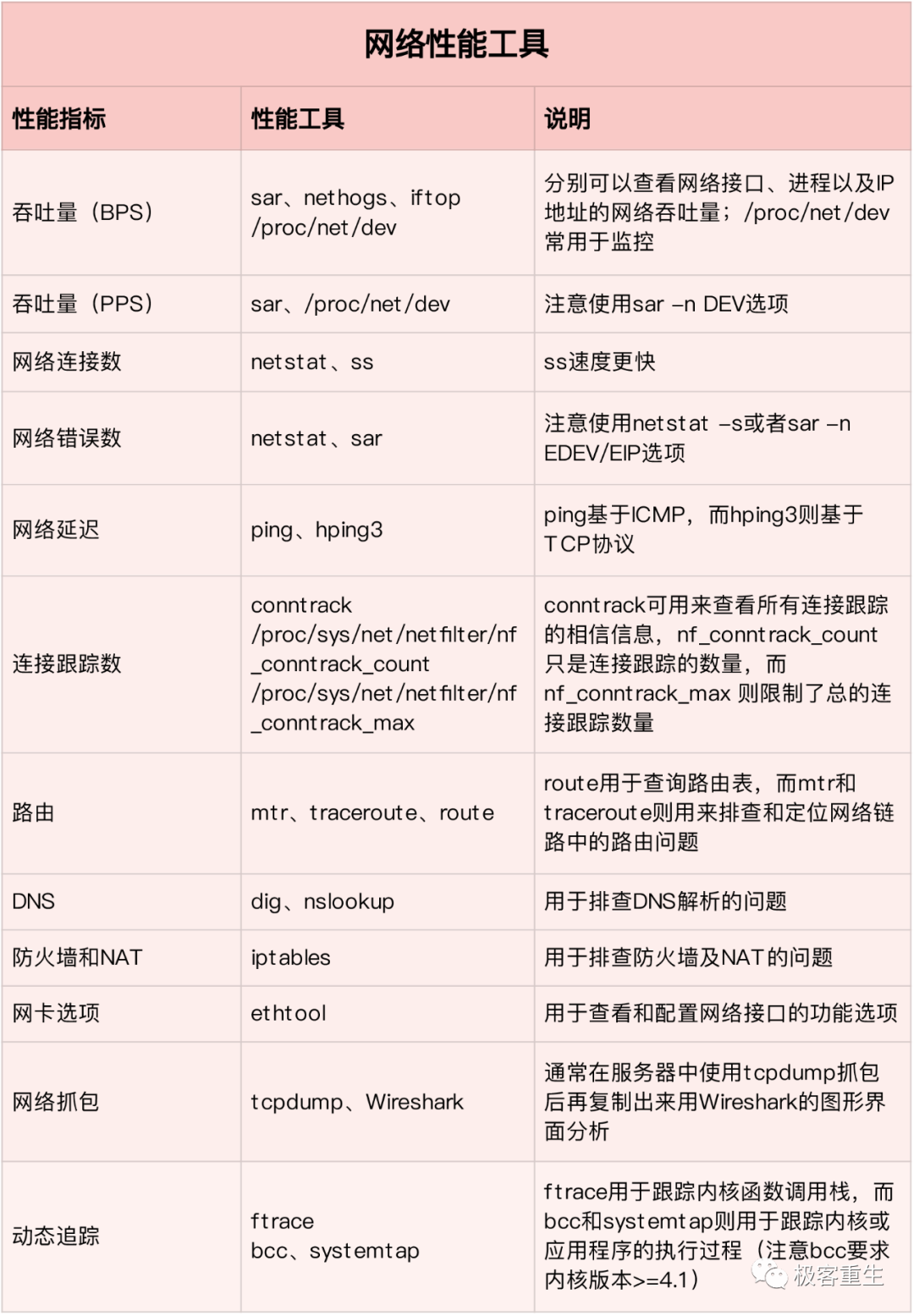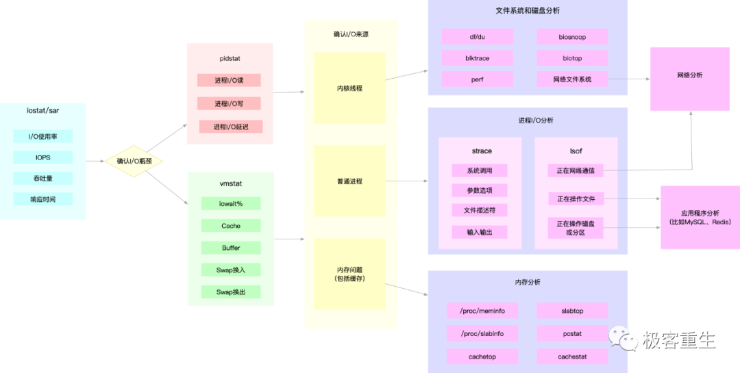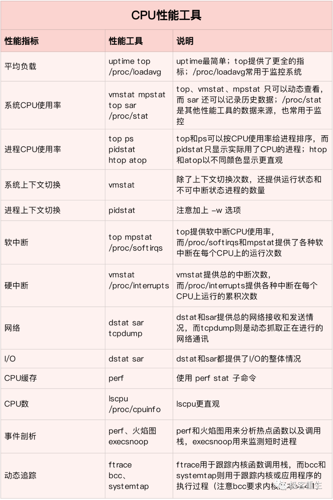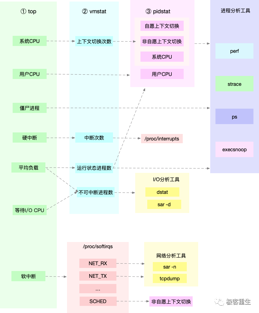 Linux 内核的各个子系统出发,汇总了对各个子系统进行性能分析时,你可以选择的工具。不过,虽然这个图是性能分析最好的参考资料之一,它其实还不够具体。比如,当你需要查看某个性能指标时,这张图里对应的子系统部分,可能有多个性能工具可供选择。但实际上,并非所有这些工具都适用,具体要用哪个,还需要你去查找每个工具的手册,对比分析做出选择。