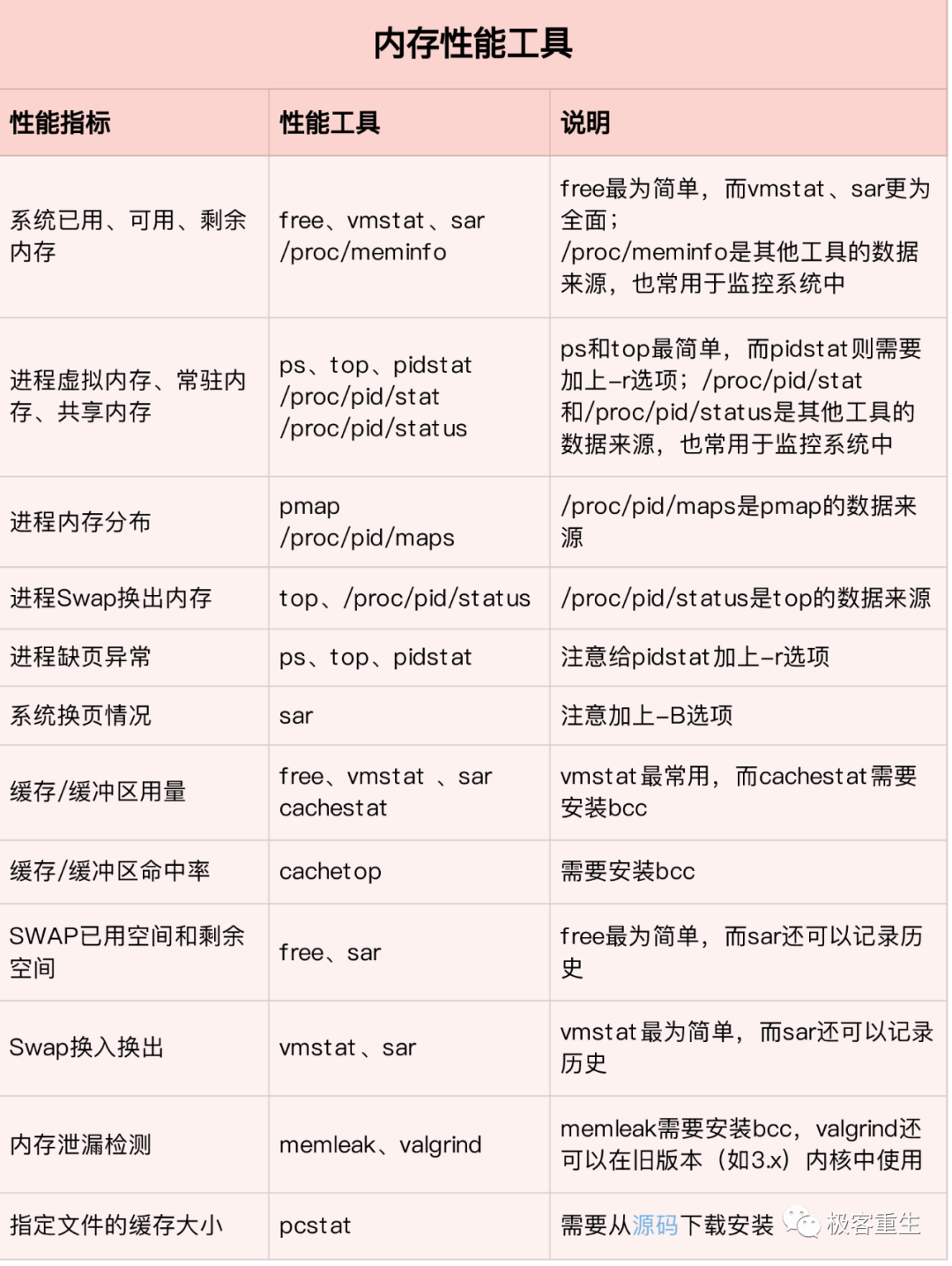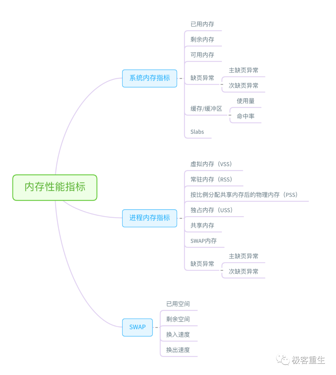 接着我们来看内存方面。从内存的角度来说,主要的性能指标,就是系统内存的分配和使用、进程内存的分配和使用以及 SWAP 的用量。下面这张图列出了常见的内存性能指标。