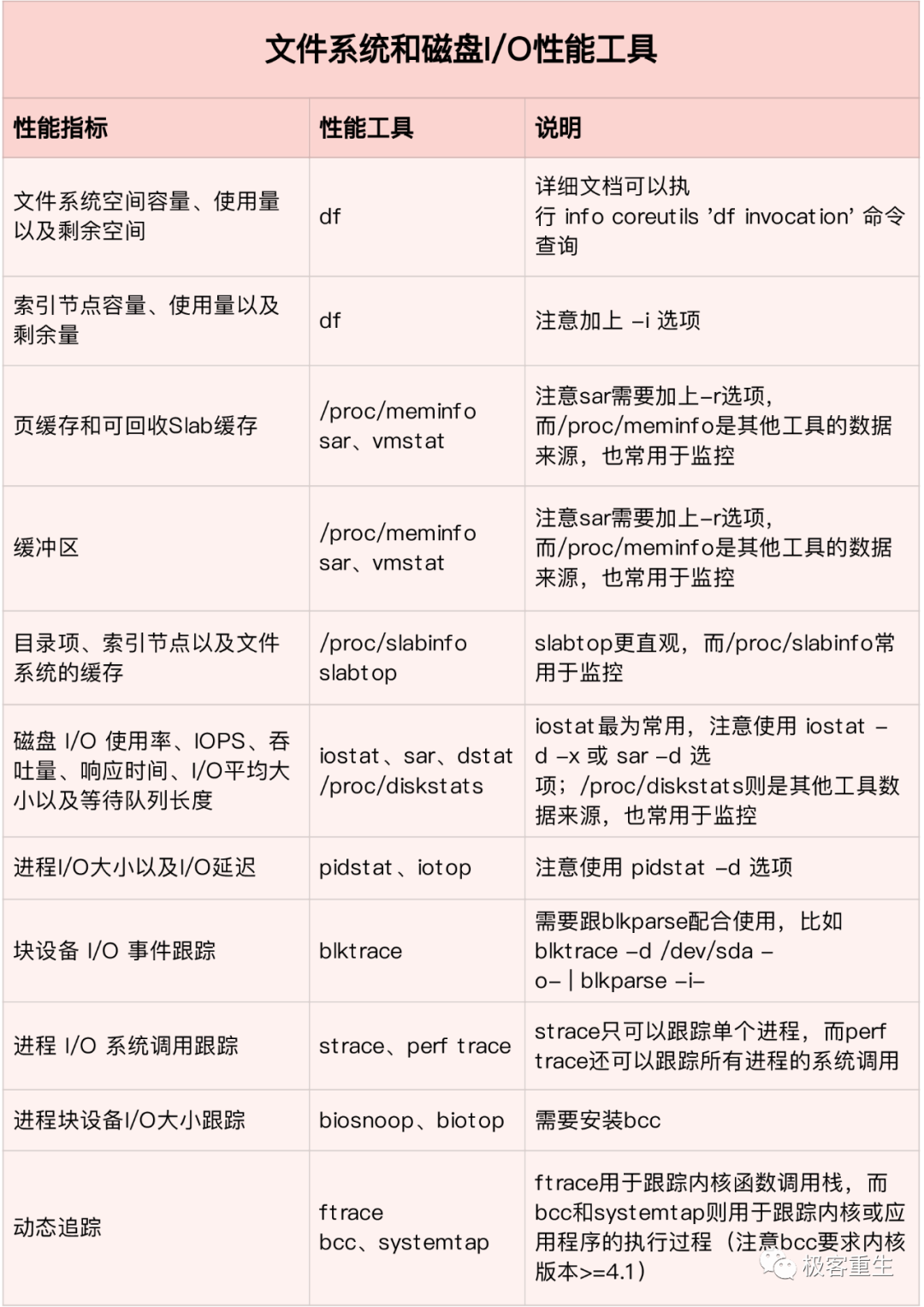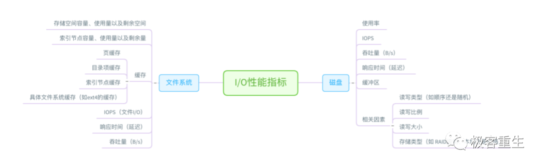 从文件系统和磁盘 I/O 的角度来说,主要性能指标,就是文件系统的使用、缓存和缓冲区的使用,以及磁盘 I/O 的使用率、吞吐量和延迟等。下面这张图列出了常见的 I/O 性能指标。