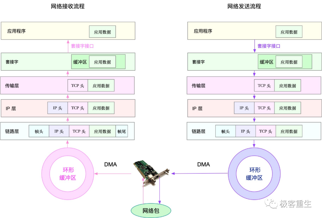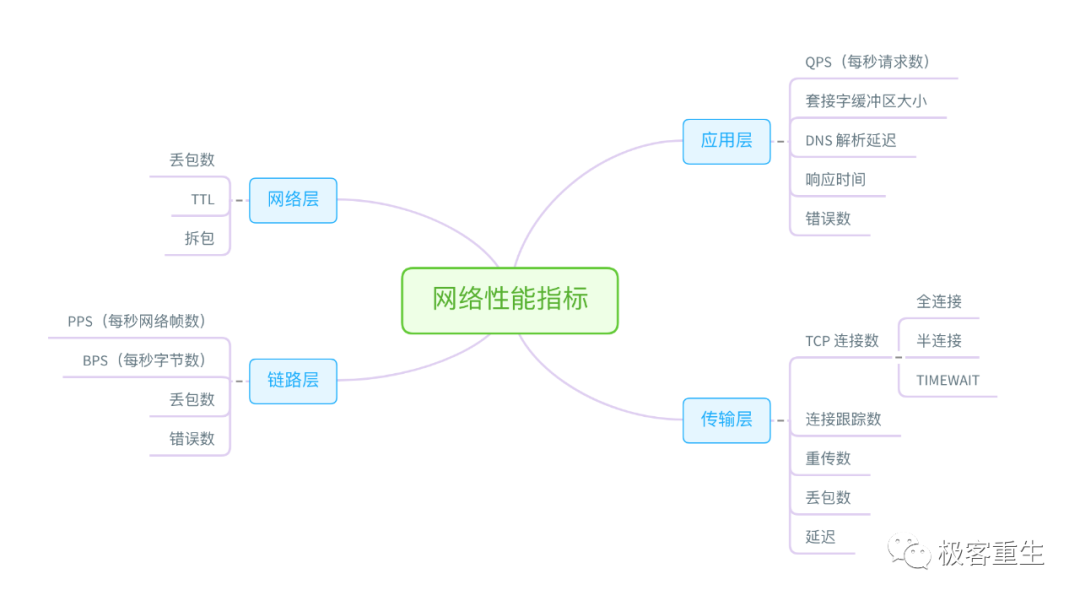 从网络的角度来说,主要性能指标就是吞吐量、响应时间、连接数、丢包数等。根据 TCP/IP 网络协议栈的原理,我们可以把这些性能指标,进一步细化为每层协议的具体指标。这里我同样用一张图,分别从链路层、网络层、传输层和应用层,列出了各层的主要指标。