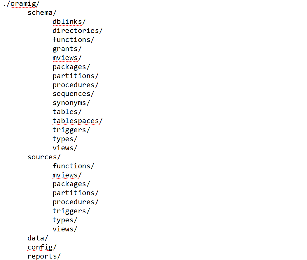 创建迁移项目后会在当前目录下生成oramig目录模板,如下所示。其中主要包含两个脚本export_schema.sh和import_all.sh,后续导出和导入即使用这两个脚本。schema和sources目录存放各对象的DDL语句,区别在于schema存放PL/SQL语法转化为PL/PGSQL后的语句, sources目录存放转化前PL/SQL的语句,data目录存放表数据文件,config目录包含配置文件ora2pg.conf,reports目录存放迁移报告。