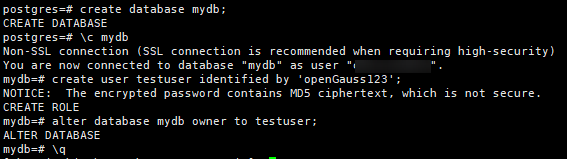 1. 先在openGauss库中创建数据库,并在该数据库下创建用户,把mydb属主设为该用户。(import_all.sh中使用PostgreSQL特有的createuser和createdb创建用户和数据库)