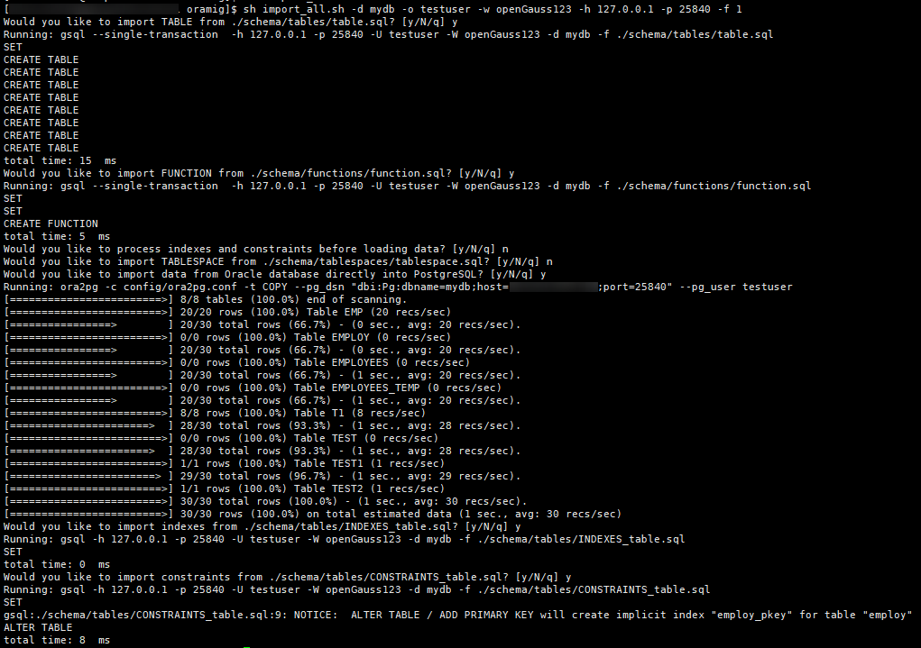 执行后会交互式提示是否导入各对象结构及数据,如下所示。(其中的-w是手动修改import_all.sh脚本,添加密码选项)