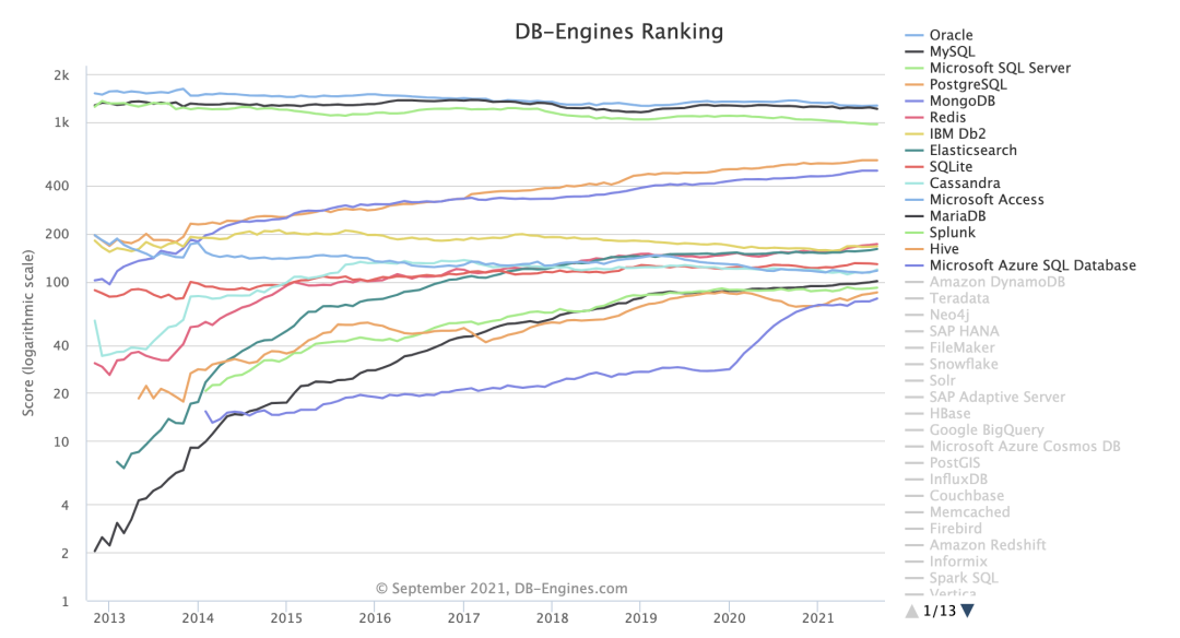 出品 | OSC开源社区(ID:oschina2013)DB-Engines Ranking 会根据受欢迎程度对数据库管理系统进行排名,排名每月更新一次。近日更新的数据显示,排名前九的依旧保持不变,按顺序依次是:Oracle、MySQL、Microsoft SQL Server、PostgreSQL、MongoDB、Redis、IBM Db2、Elasticsearch 和 SQLite。