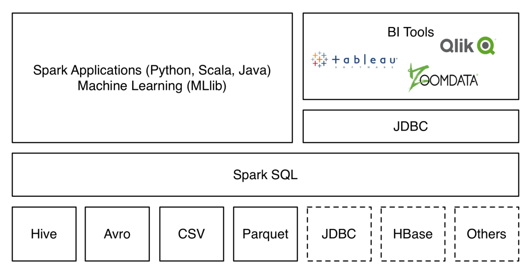 在数据集成这块,Spark 很早就提供了 Data source API,支持多种数据源,如 Hive、Avro、CSV,也包括 JDBC 数据源: