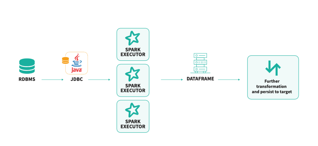 过去需要先通过 Sqoop 导入数据到 Hadoop、再跑任务进行处理的工作,如今可以直接缩减成:直接读取 JDBC 数据进内存成为 dataframe, 然后使用各类 Spark API 进行处理,如下图所示: