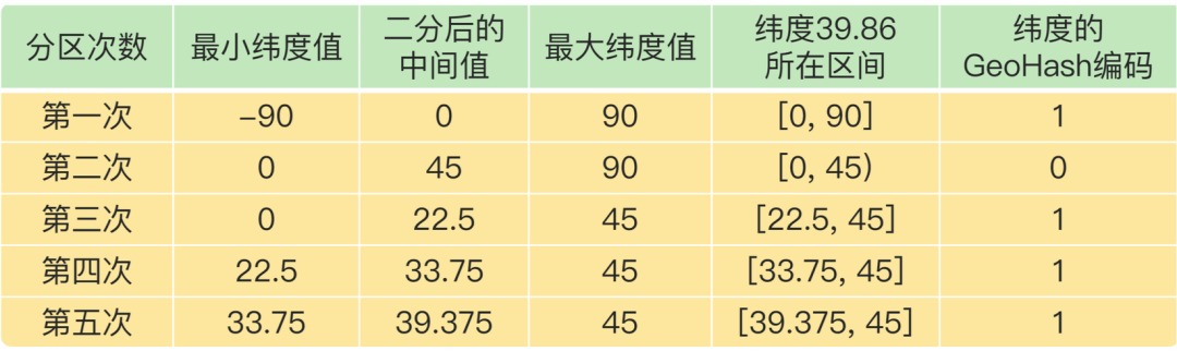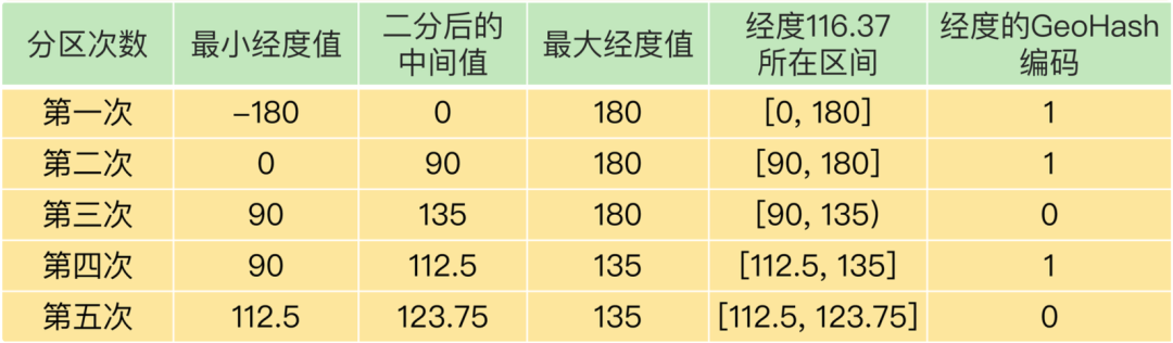 按照这种方法,做完 5 次分区后,我们把经度值 116.37 定位在[112.5, 123.75]这个区 间,并且得到了经度值的 5 位编码值,即 11010。这个编码过程如下表所示: