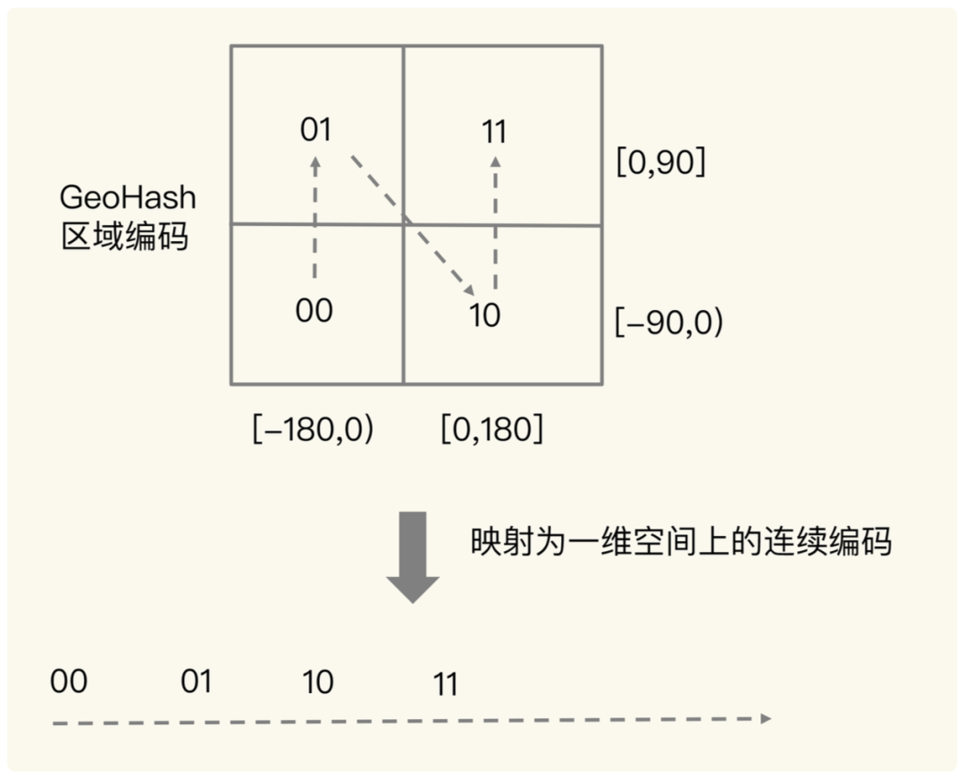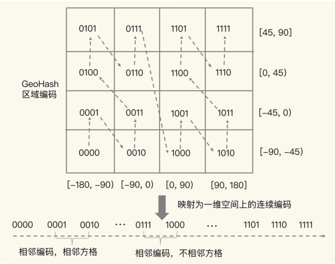 上文讲了GeoHash的计算步骤,仅仅说明是什么而没有说明为什么?为什么分别给经度和维度编码?为什么需要将经纬度两串编码交叉组合成一串编码?本节试图回答这一问题。