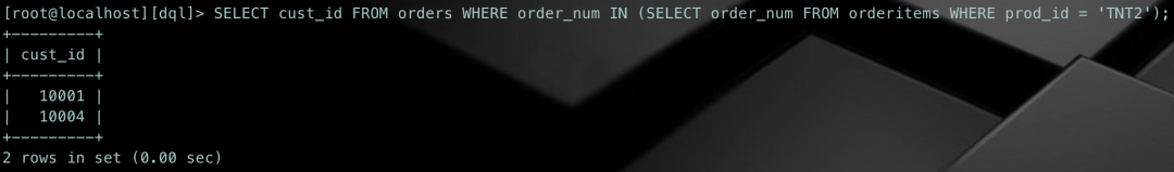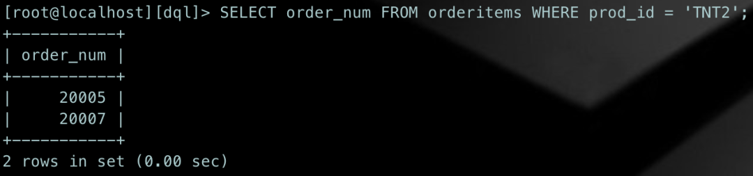 第一条SELECT语句的含义很明确,对于prod_id为TNT2的所有订单物品,它检索其order_num列。输出列出两个包含此物品的订单: