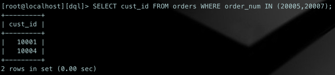 下一步,查询具有订单20005和20007的客户ID。利用IN子句,编写如下的SELECT语句: