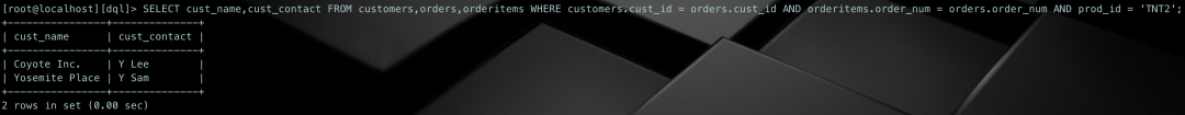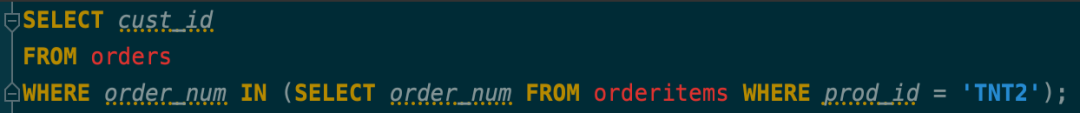 现在回顾一下「使用子查询」中的例子,该例子如下所示,其SELECT语句返回订购产品TNT2的客户列表: